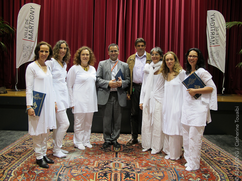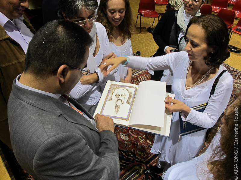 Le groupe « AISA Côte d’Azur » est un ensemble de femmes du Sud de la France engagées dans un chemin spirituel, la Tariqa Alâwiyya. Elles témoignent de la richesse et la beauté des chants soufis. Karima offre au Père Jaje le Diwan du Cheikh al-Alâwi.